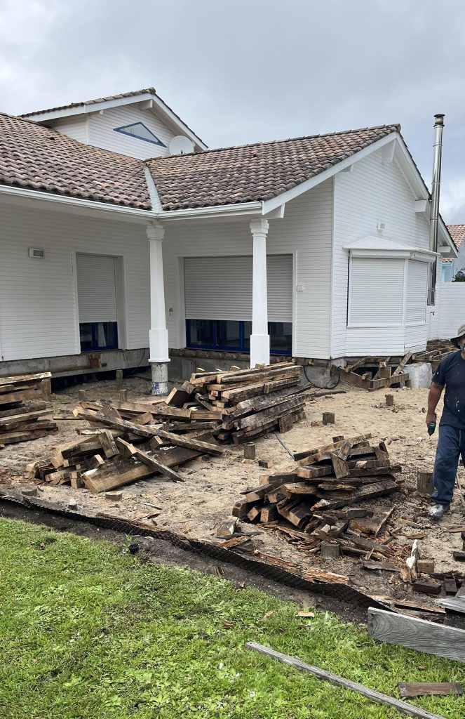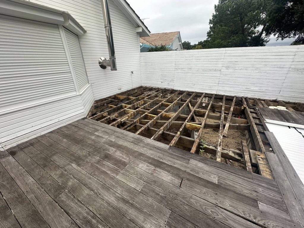 Sur la troisième, nos équipes procèdent au démontage complet de l’ancienne terrasse, planche après planche, avec tri sélectif des déchets bois pour un envoi en déchetterie agréée.