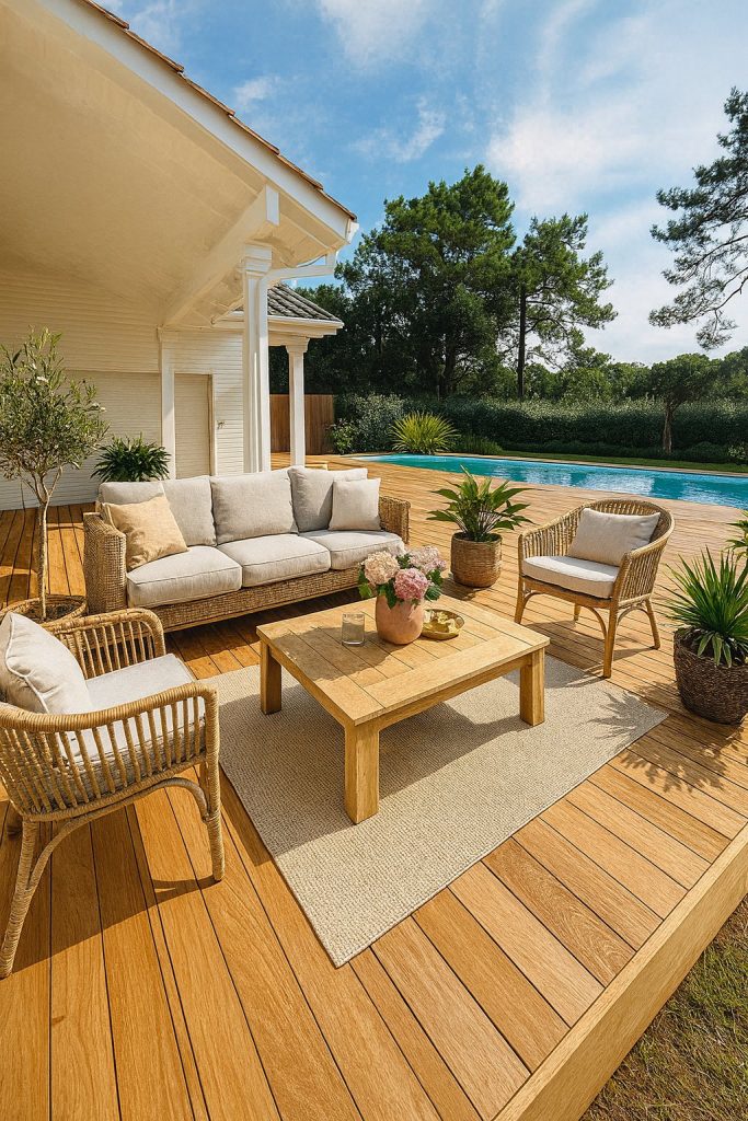 - Un coin salon extérieur confortable et harmonieux, preuve qu’une terrasse bien conçue devient une véritable pièce de vie.